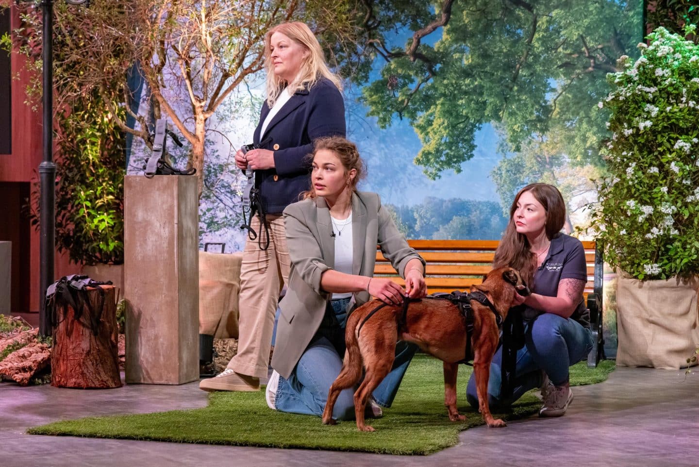 Andrea Heuser (l.) und Fiona Consuela Czerwionke präsentieren den „Löwen“ das ausbruchsichere und verwicklungsfreie Leinenführsystem dogs-guard. Lisa Parczanny (r.) mit Hündin „Mila“ unterstützen sie bei dem Pitch. +++ Die Verwendung des sendungsbezogenen Materials ist nur mit dem Hinweis und Verlinkung auf RTL+ gestattet. +++