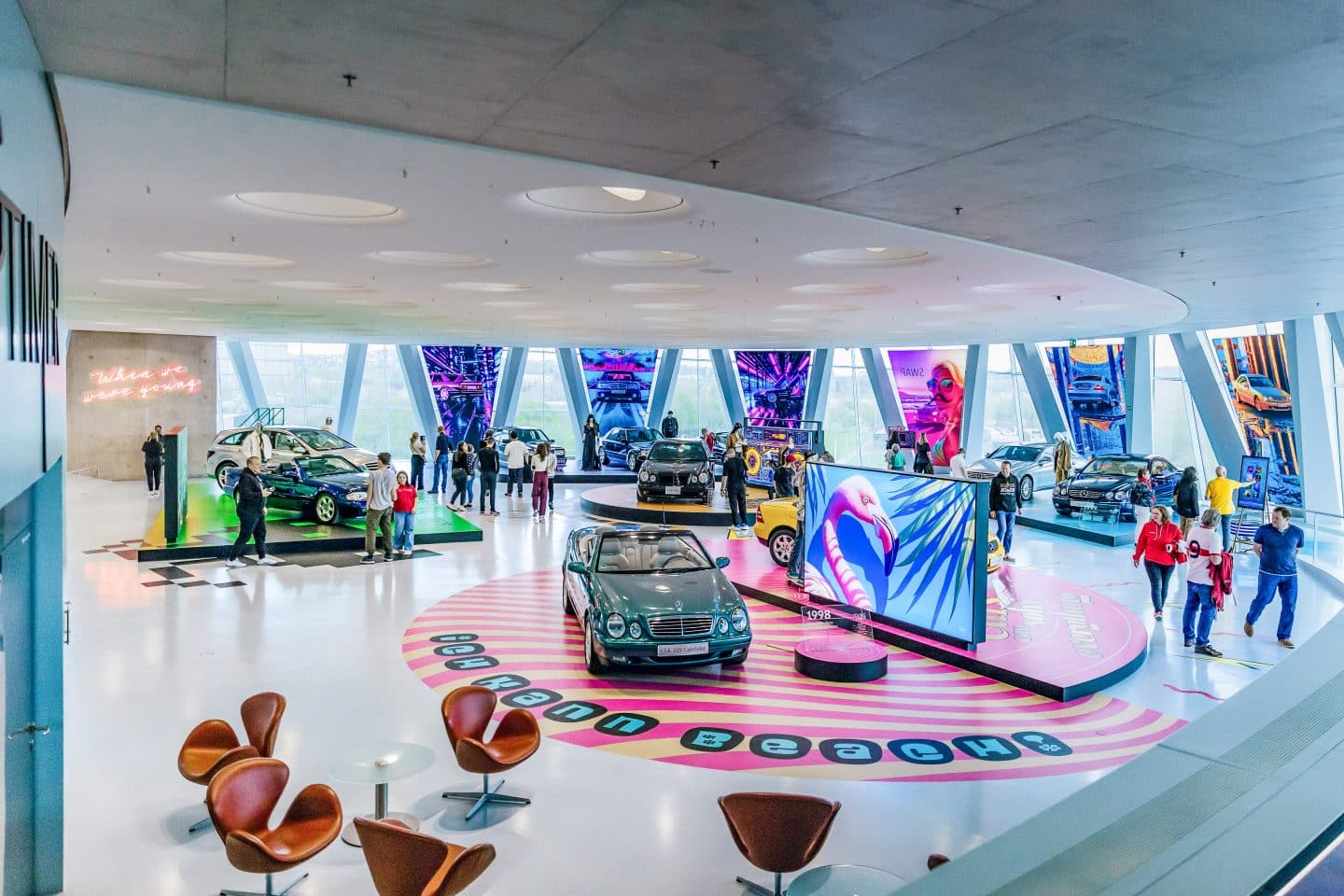 Sonderausstellung „Youngtimer“ im Mercedes-Benz Museum vom 11. April bis 2. November 2025 im Raum Collection 5. Überblicksaufnahme mit der Themeninsel „Easy Life“ vorn und der Themeninsel „Feinsinn“ rechts hinten. Foto: Thomas Niedermüller. (Fotosignatur der Mercedes-Benz Classic Archive: D854977) “Youngtimer” special exhibition at the Mercedes-Benz Museum from 11 April to 2 November 2025 in Collection Room 5. General view showing the “Easy Life” thematic display island at the front and the “Feinsinn” (“Refinement”) thematic display island at the back right. Photo: Thomas Niedermüller. (Photo index number in the Mercedes-Benz Classic Archive: D854977)