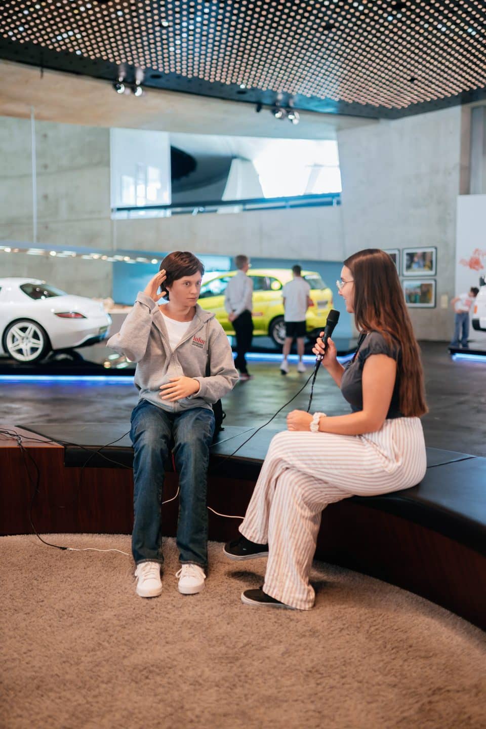 Mercedes-Benz Museum, Raum Mythos 6: Aufbruch – Der Weg zur emissionsfreien Mobilität. Der androide Roboter Andrea der Hochschule der Medien Stuttgart (HdM) ist vom 13. bis 18. Mai 2025 wieder im Museum zu Gast. Foto einer Gesprächssituation. (Fotosignatur der Mercedes-Benz Classic Archive: D841539) Mercedes-Benz Museum, Legend Room 6: Setting out – the road to emission-free mobility. Andrea the android robot from Stuttgart Media University (HdM) will be a guest at the Museum again from 13 to 18 May 2025. Photo of a human-robot encounter. (Photo index number in the Mercedes-Benz Classic Archive: D841539)