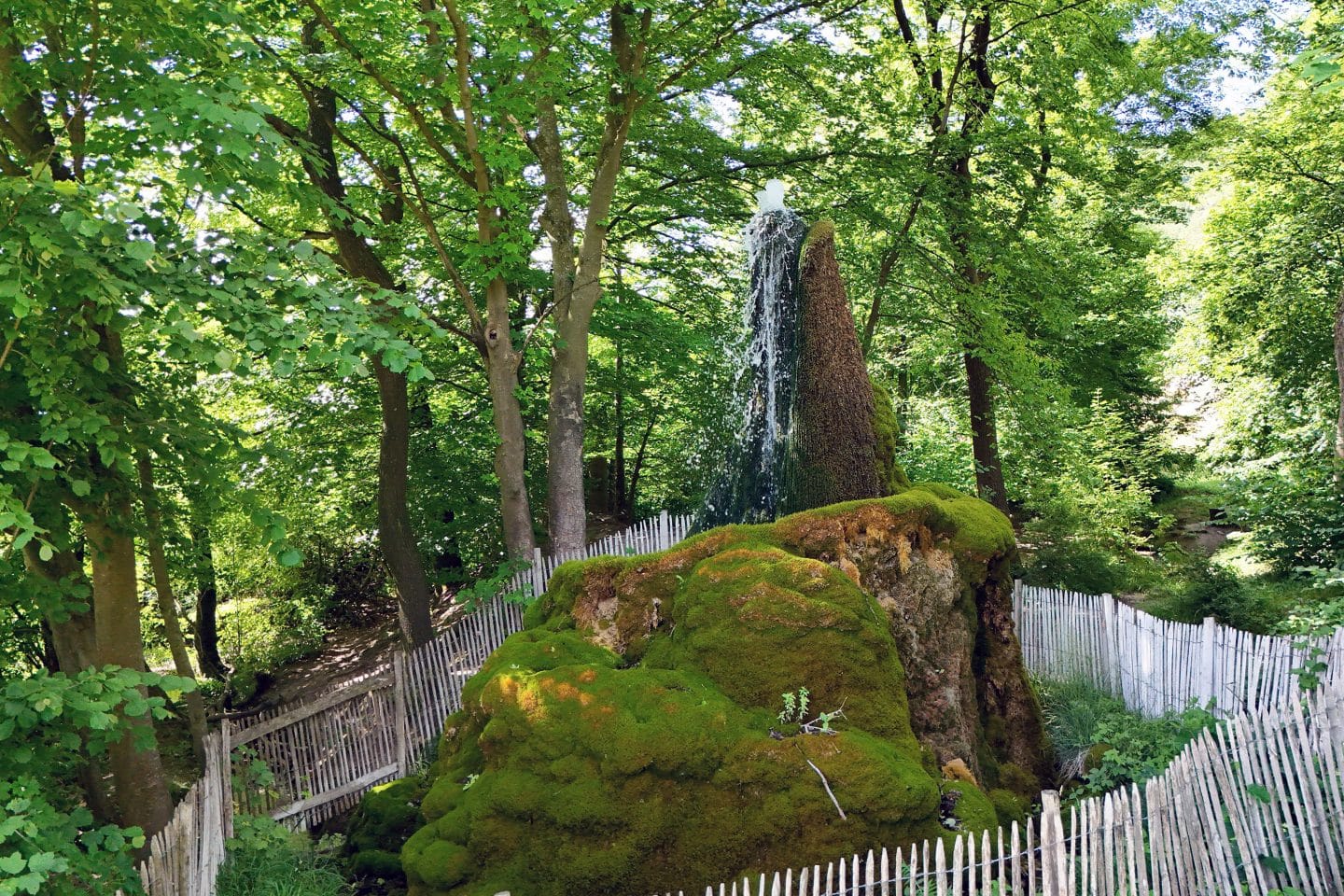 Ein geologisches Kunstwerk: Der Wasserbaum entstand durch Kalksinter, der sich über Jahrzehnte aus einer Quelle ablagerte. Schicht um Schicht formte sich ein baumähnliches Tuffsteingebilde. In dieser feuchten Umgebung gedeihen spezielle Moose, Flechten und Kleinlebewesen, die sich perfekt angepasst haben.