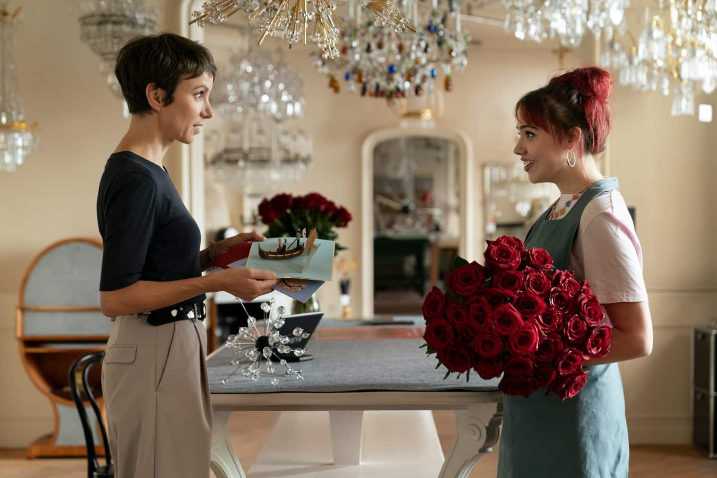 Judith (Julia Koschitz, l.) hat von Hannes eine Einladung nach Venedig erhalten. Im Gegensatz zu Bianca (Mara Romei, r.), die die beigelegten roten Rosen sehr romantisch findet, fühlt Judith sich eher genötigt.