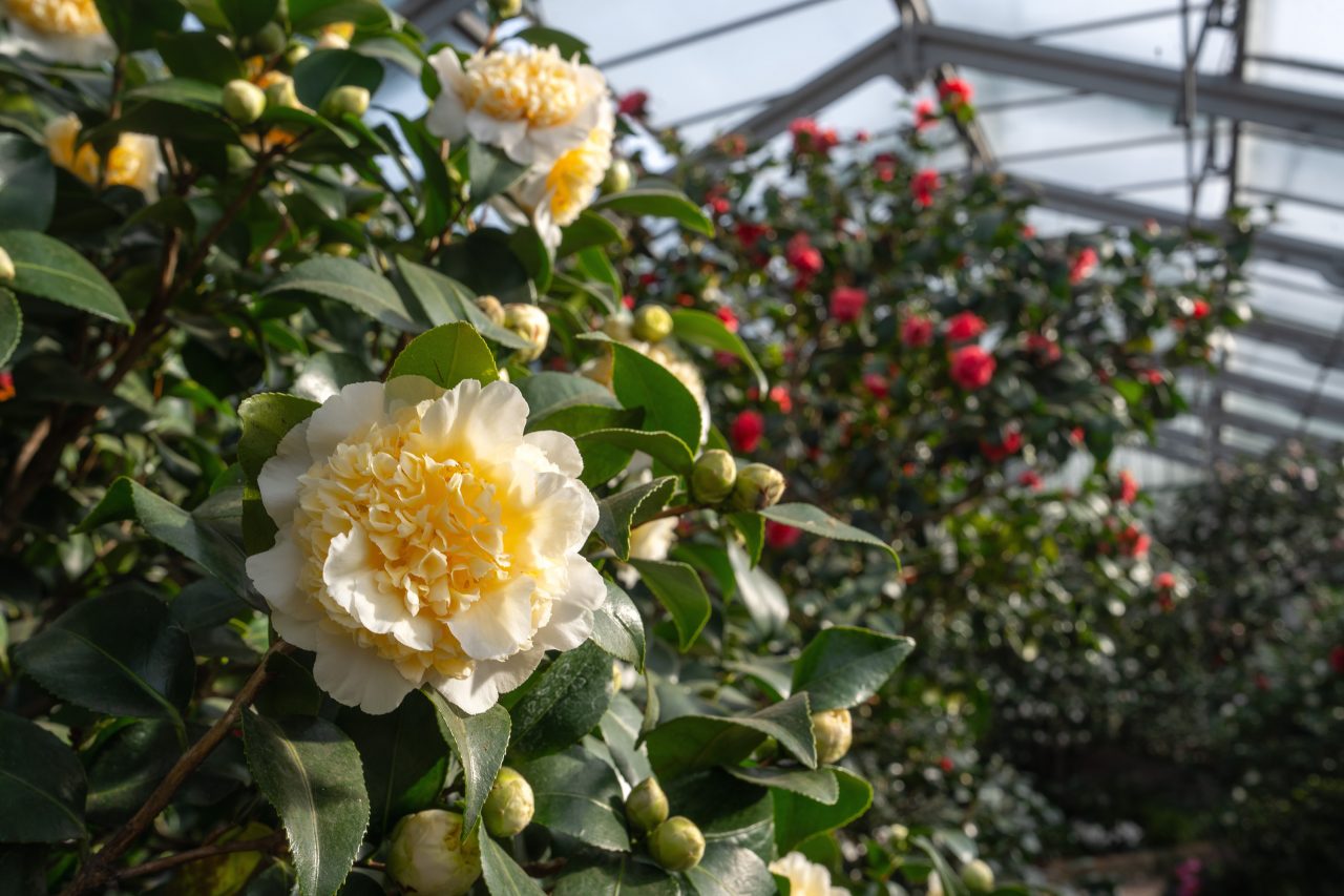Betritt man das Kamelienhaus in der Historischen Gewächshauszeile, taucht man sofort in eine Welt voller Farben und Formen ein. Die Kamelien präsentieren sich in einem Meer aus Weiß, Gelb, Rosa und Rot, ihre Blütenpracht lässt erahnen, warum sie einst als Modeblume einer ganzen Epoche galten.