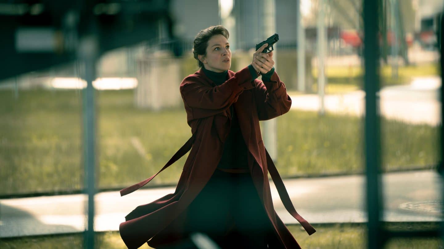 Katharina Tempel (Franziska Hartmann) zieht ihre Waffe.