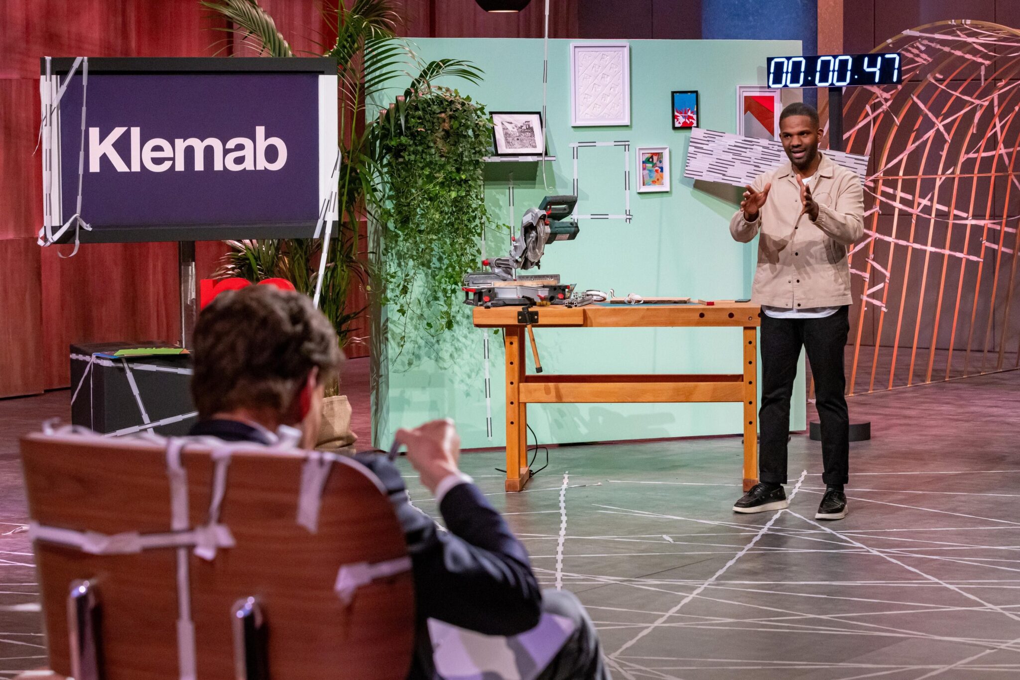 Der Leipziger Produktdesigner Vick de Froz Jorge Manuel (32) stellt in der TV-Show „Die Höhle der Löwen“ sein Produkt Klemab vor – ein selbstklebendes Maßband, das direkt auf Oberflächen angebracht werden kann und dort als Mess- und Markierhilfe dient.