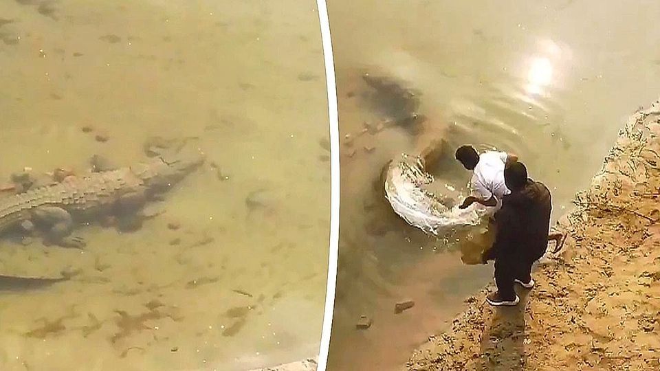 Eine Gruppe Jugendlicher in der indischen Stadt Kasganj handelte extrem leichtsinnig: Die Teenager entdeckten ein regloses Krokodil im Wasser und zogen das Reptil am Schwanz. Doch das Raubtier war alles andere als tot.