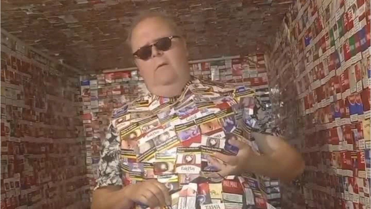 Ein Mann tanzt in einem Anzug aus Zigarettenschachteln und die ganze Welt schaut zu.