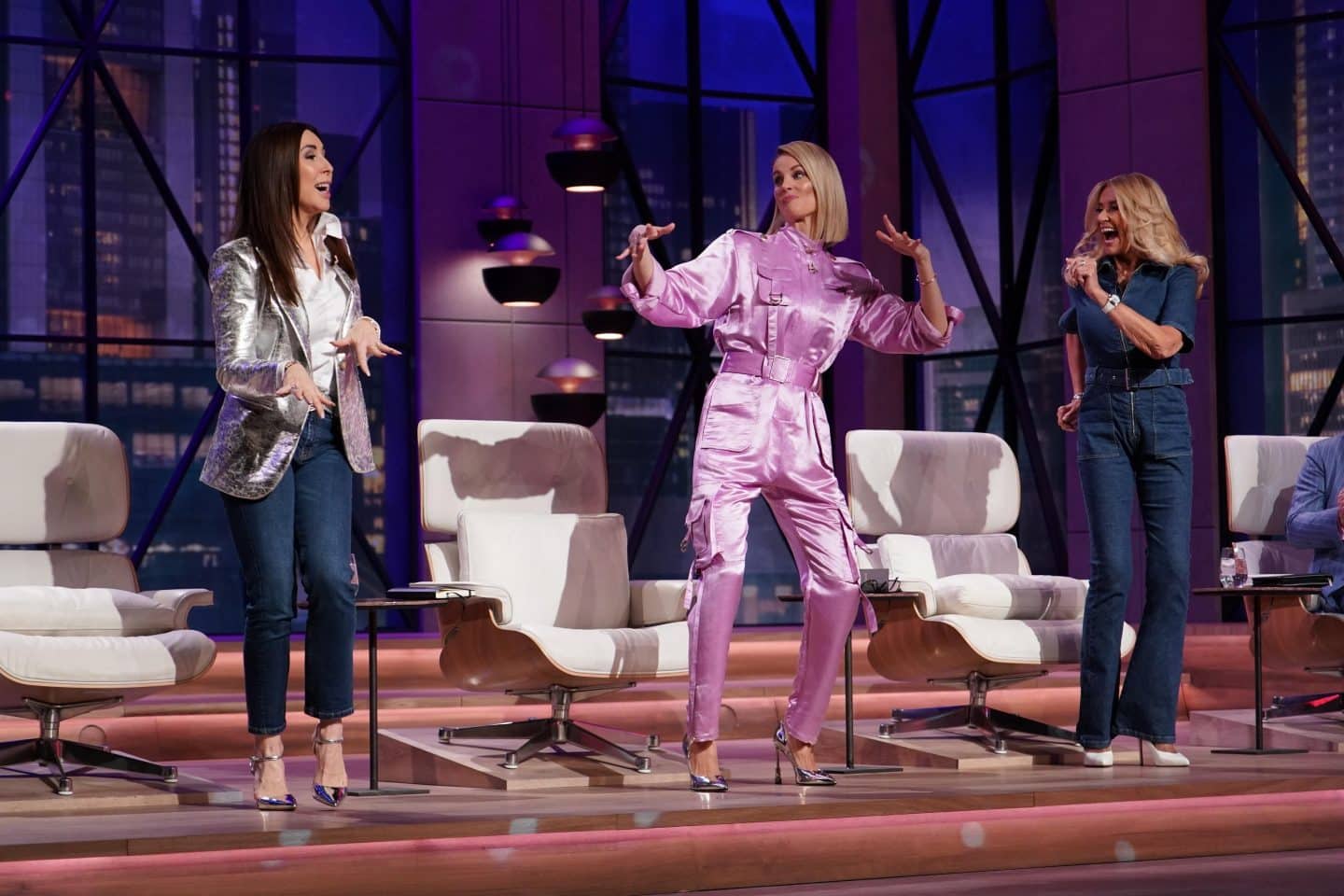 Gründer Arne Engelke arbeitet auch als DJ. Zu Beginn des Pitches von „Krydda“ tanzen die Investorinnen (v.l.) Judith Williams, Janna Ensthaler und Dagmar Wöhrl beschwingt ins Studio. +++ Die Verwendung des sendungsbezogenen Materials ist nur mit dem Hinweis und Verlinkung auf RTL+ gestattet. +++
