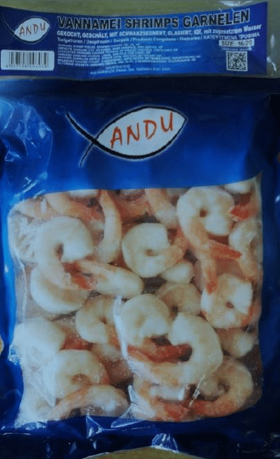 Es handelt sich um ANDU Vannamei Shrimps Garnelen, die gekocht, geschält, mit Schwanzsegment, glasiert und tiefgefroren sind. Die Verpackung weist die Chargennummer VN154V006 auf und hat eine Nettofüllmenge von 800 Gramm. Das Mindesthaltbarkeitsdatum ist der 08. Februar 2026. Sollten Sie das Produkt besitzen, wird empfohlen, es umgehend zurückzugeben.