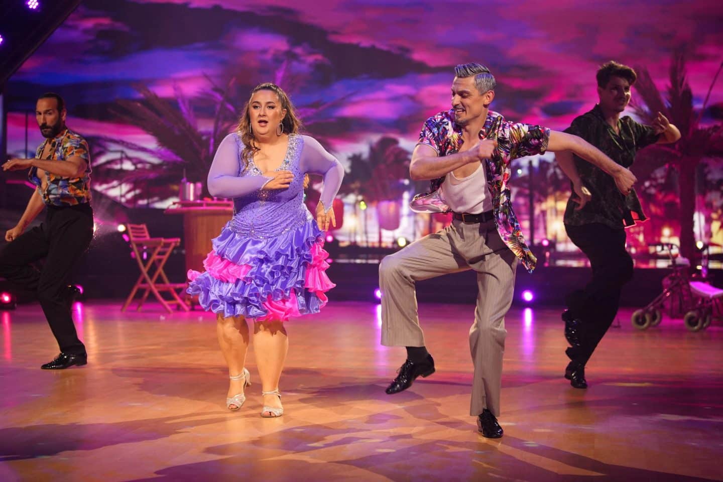 Auch für Podcasterin Sandra Safiulov (25), bekannt als „Selfiesandra“, und ihren Tanzpartner Zsolt Sándor Cseke (37) war der Druck immens. Die 25-Jährige, die sich stolz zeigte, „die letzte Frau sein darf in der Show“, legte einen Tango zu „Dernière Danse“ (23 Punkte) und eine energiegeladene Salsa zu „Mayores“ (25 Punkte) aufs Parkett. Motsi Mabuse fand für den Tango anerkennende Worte: „Insgesamt habt ihr einen guten Job gemacht.“ Ihr Impro-Dance, eine Rumba, brachte ihnen weitere 26 Punkte ein.