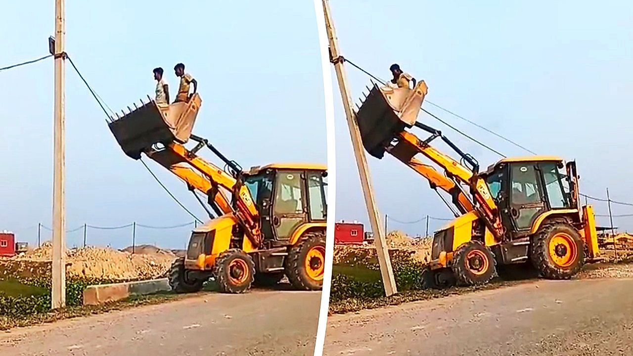 Zwei Arbeiter im indischen Bundesstaat Assam ließen sich in einer Baggerschaufel an einen Strommast heranfahren. Dann gab der Baggerfahrer allerdings versehentlich Gas.
