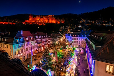 Romantik pur! Der Heidelberger Weihnachtsmarkt erstreckt sich über mehrere Plätze in der Altstadt – vom Universitätsplatz bis zum Kornmarkt. Über allem thront das weltberühmte Schloss, das bei Dunkelheit angestrahlt wird. Besonders beliebt ist die Eisbahn auf dem Karlsplatz mit Blick auf die Schlossruine.