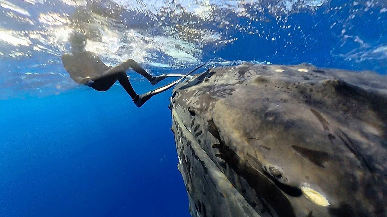 Vor Moorea in Französisch-Polynesien trafen Taucher auf ein verspieltes Buckelwal-Weibchen. Das zwölf Meter lange Tier schubste einen von ihnen mit der Nase herum.