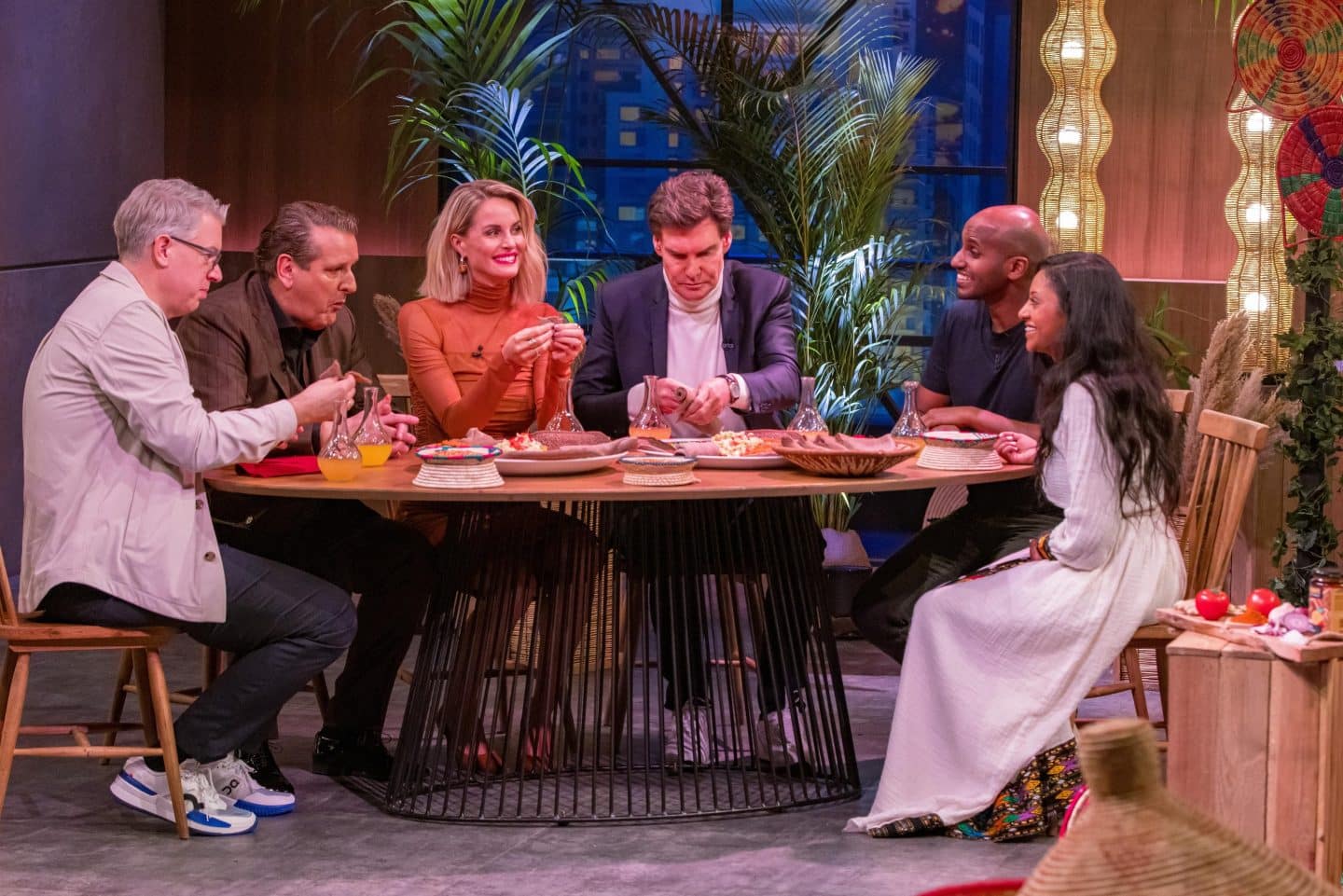 Yemi Desalegn (r.) und Bahleby Tewelde präsentieren den „Löwen“ (v.l.) Frank Thelen, Ralf Dümmel, Janna Ensthaler und Carsten Maschmeyer mit Mamaye Eritreisches Essen aus dem Glas. +++ Die Verwendung des sendungsbezogenen Materials ist nur mit dem Hinweis und Verlinkung auf RTL+ gestattet. +++