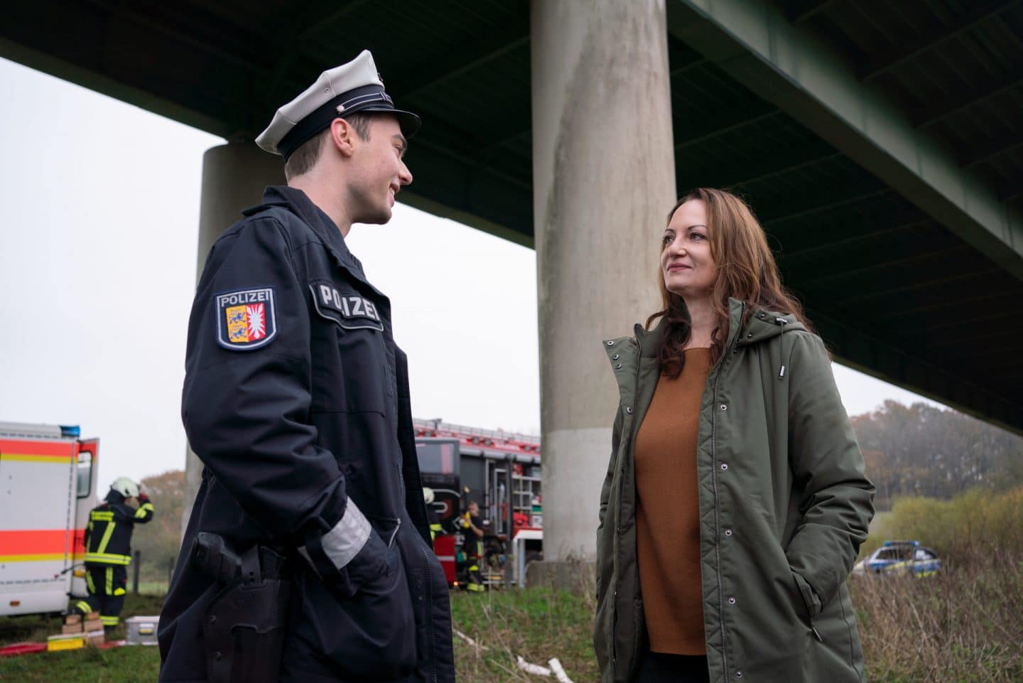 Lukas Jepsen (Tom Gronau) und Jana Winter (Natalia Wörner) unterhalten sich am Unfallort.