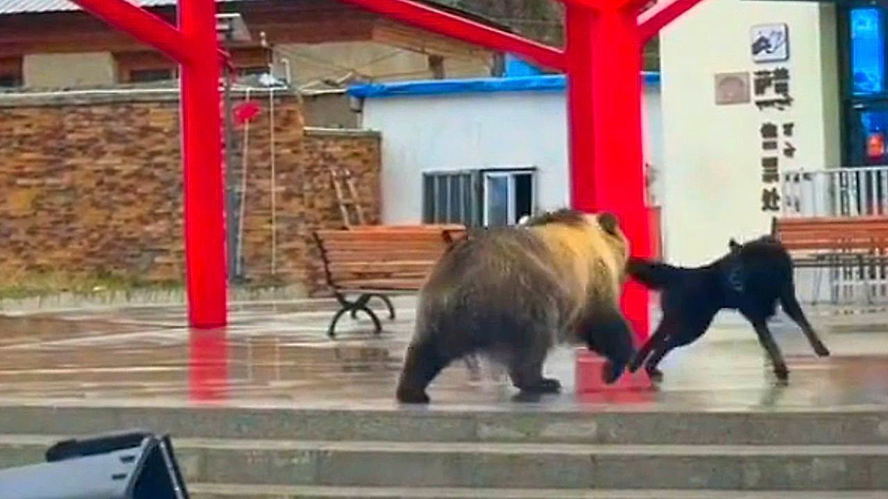 Dramatische Szene in Nagqu in Tibet: Ein Bär durchwühlte Mülltonnen auf einem Parkplatz – doch dann stellte sich plötzlich ein mutiger Hund dem Raubtier entgegen.