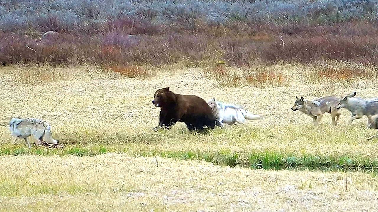 Im Yellowstone-Nationalpark im US-Bundesstaat Wyoming hatten es sowohl ein Grizzlybär als auch ein Wolfsrudel auf ein Büffel-Aas abgesehen. Es entwickelte sich ein nervenaufreibender Kampf.