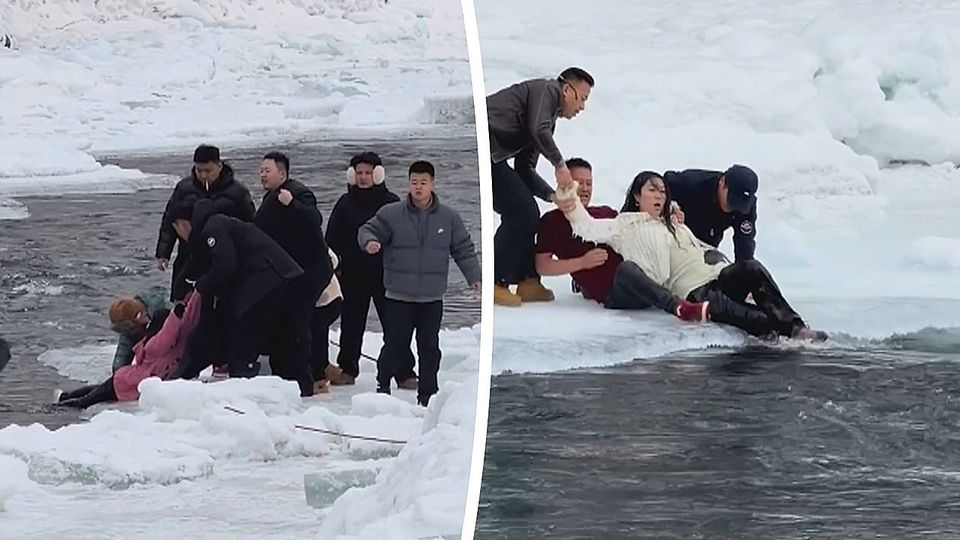 Dramatische Szenen an einem Fluss in der chinesischen Region Xinjiang: Ein Mädchen war in das eisige Wasser gefallen, die Mutter sprang hinterher. Touristen wurden zu Lebensrettern.
