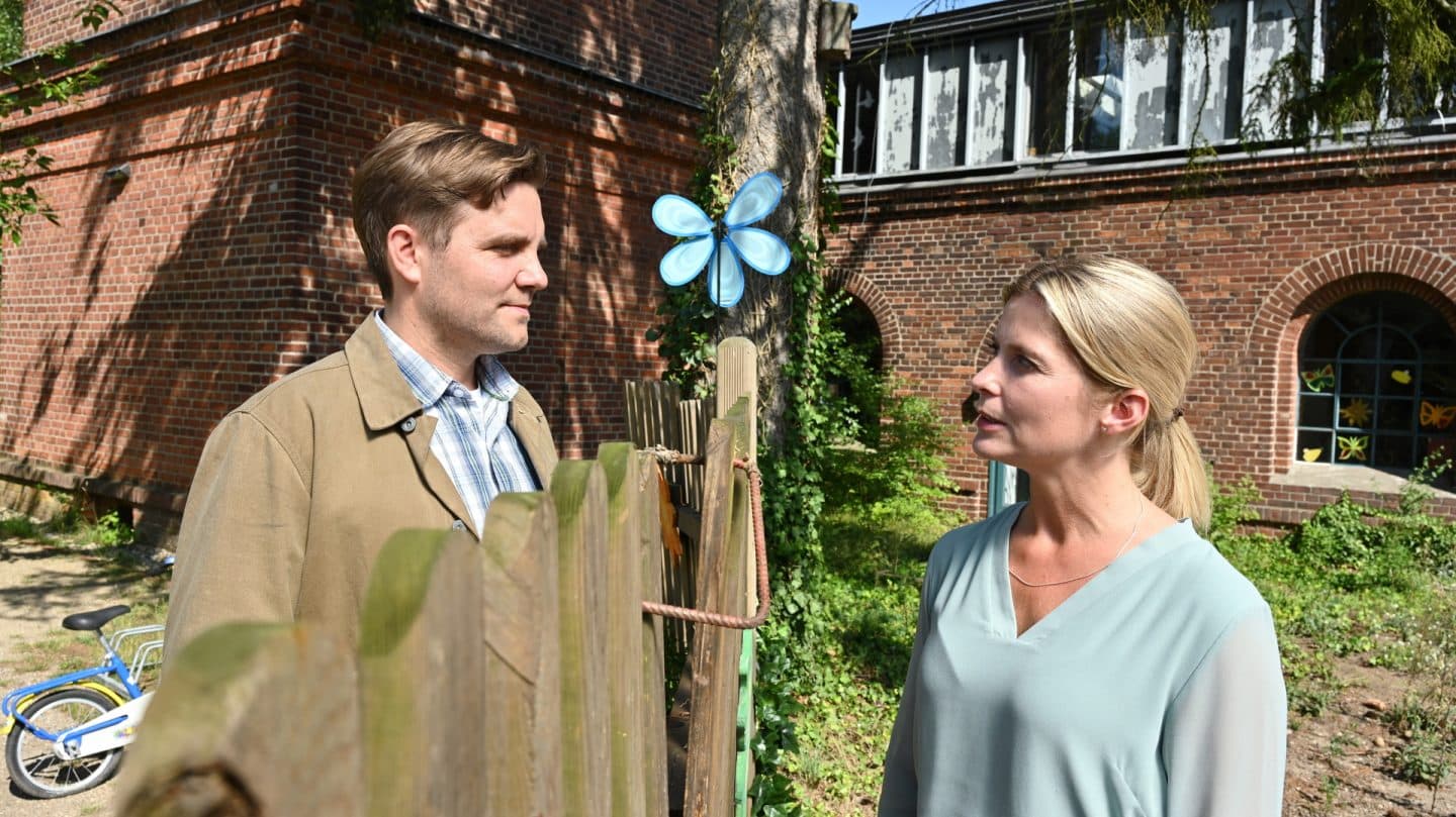 Katharina (Valerie Niehaus, r.) fragt sich zunächst, wer wohl der unbekannte Mann (Sebastian Klein, l.) ist, der vor dem Kindergarten steht und die Kinder beobachtet.