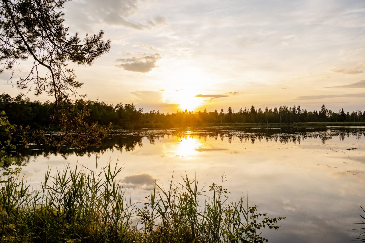 Der Tag endet am malerischen Riedsee. Die untergehende Sonne taucht die Landschaft in ein zauberhaftes Licht, während Libellen über das Wasser surren und Haubentaucher friedlich vorbeiziehen. Vögel zwitschern, das Schilf raschelt sanft im Wind – ein perfekter Moment zum Innehalten und Genießen. Einfach mal nichts tun und die Seele baumeln lassen. Hier sind wir nur Zuschauer, und das tut richtig gut. Der Riedsee bietet die perfekte Kulisse für einen romantischen Abend oder einfach nur für eine entspannte Auszeit vom Alltag. Die Spiegelbilder der Wolken auf der ruhigen Wasseroberfläche und das leise Summen der Insekten schaffen eine fast schon magische Atmosphäre, die man so schnell nicht vergisst.
