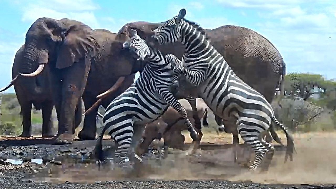 Wilde Szenen an einem Wasserloch bei den Chyulu Hills in Kenia: Eine Elefantenherde stillte entspannt ihren Durst – da störten plötzlich zwei aggressive Zebras die Idylle.