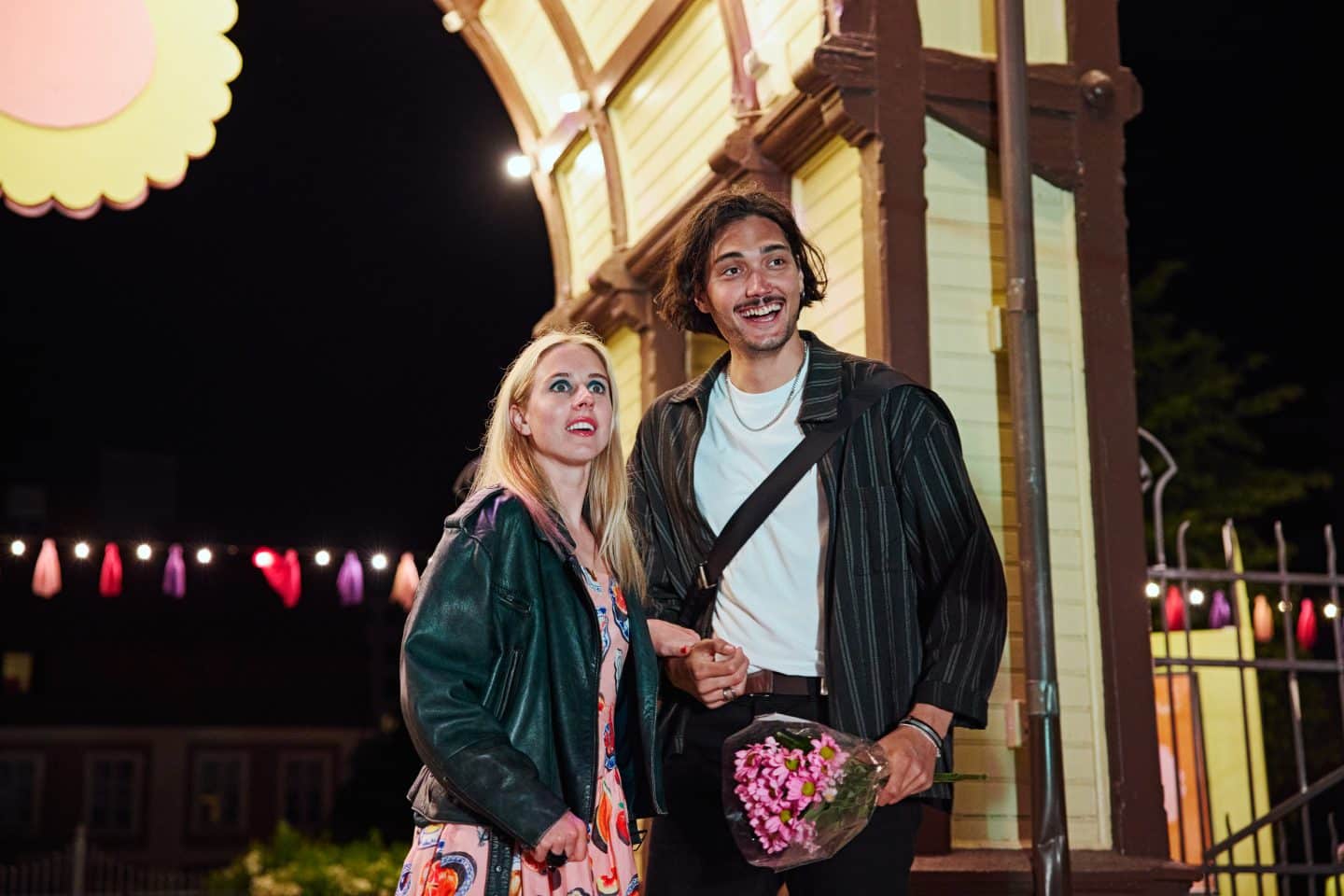 Halva Malmö. (L to R) Carla Sehn as Amanda and Adam Dahlström as Bartendern in Halva Malmö. Cr. Courtesy of Netflix © 2024