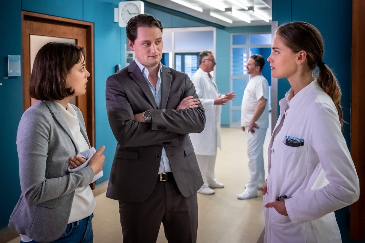 Dr. Eva Grünberg (Laura Berlin, r.) entgeht nicht der Druck, den Hannah Jacobis (Valerie Stoll, l.) Manager Valentin Vasmer (Maximilian Hildebrandt, M.) auf die Pianistin ausübt.