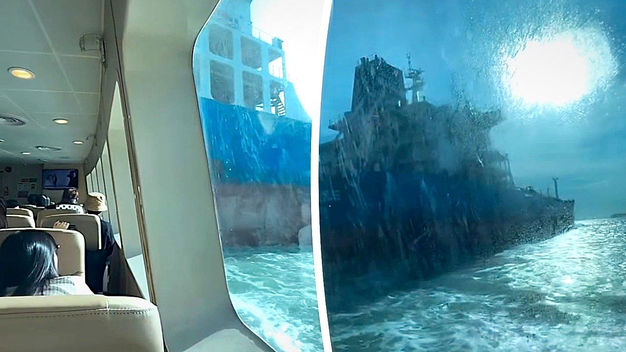 Panik an Bord einer Passagierfähre in der Straße von Singapur am Montag: Ein Öltanker stieß mit dem Schiff zusammen – die Fahrgäste schrien vor Schreck auf. Glücklicherweise wurde niemand verletzt.