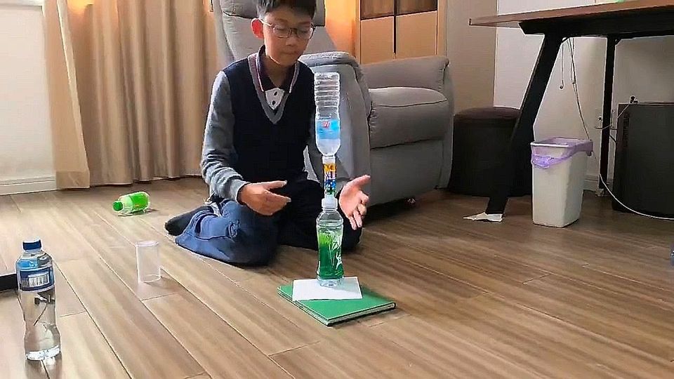 Ein Junge in der chinesischen Provinz Zhejiang versuchte, eine Plastikflasche auf einen fragilen Turm aus Würfeln und einer Flasche zu werfen. Dann gab es Jubelschreie.