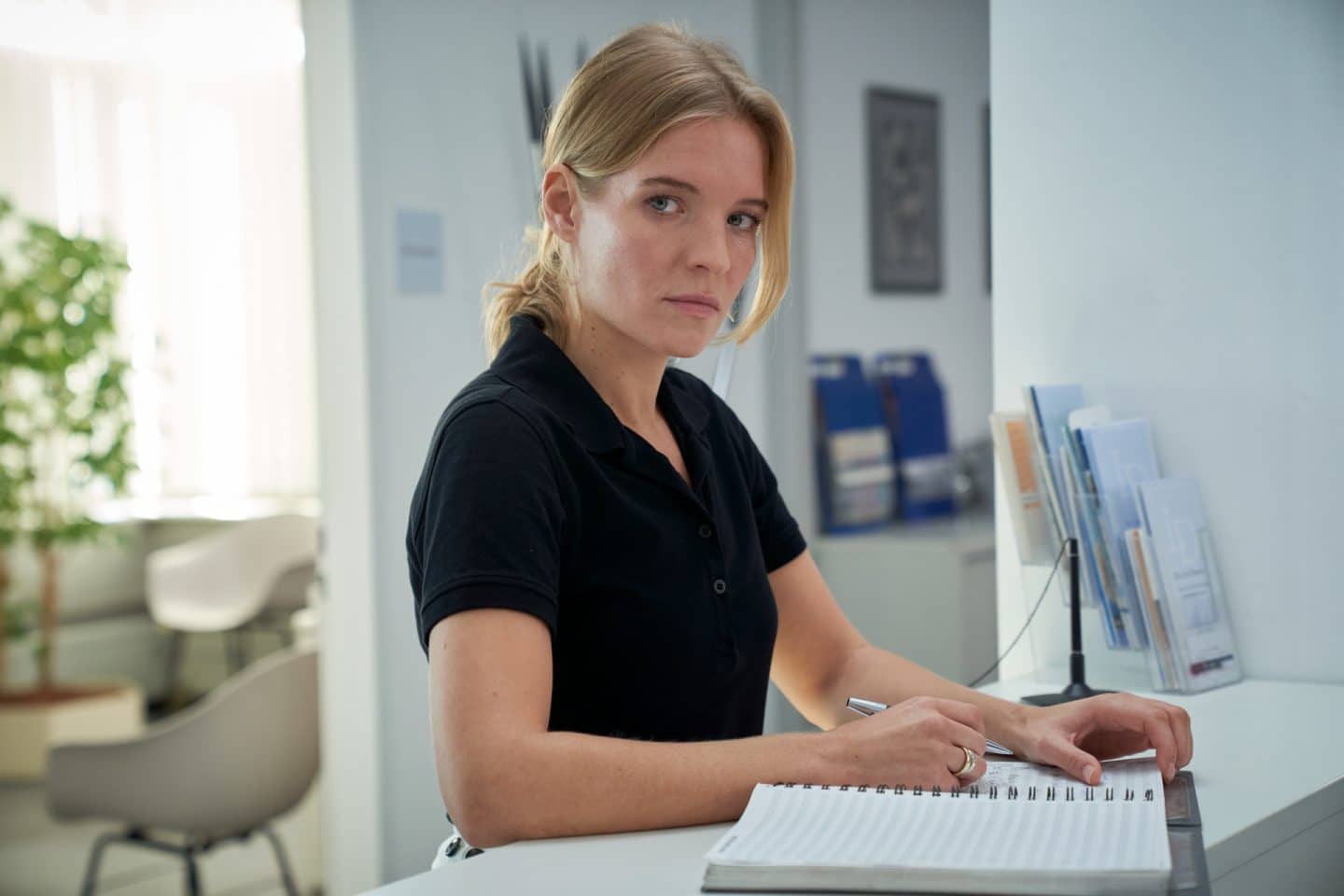 Julia Krieger (Bea Brocks) verfolgt ein Verhör aus dem Nebenzimmer von Marie Brand mit Dr. Dreier. Julia versucht zu verstehen, was Marie Brand von Dr. Dreier will.