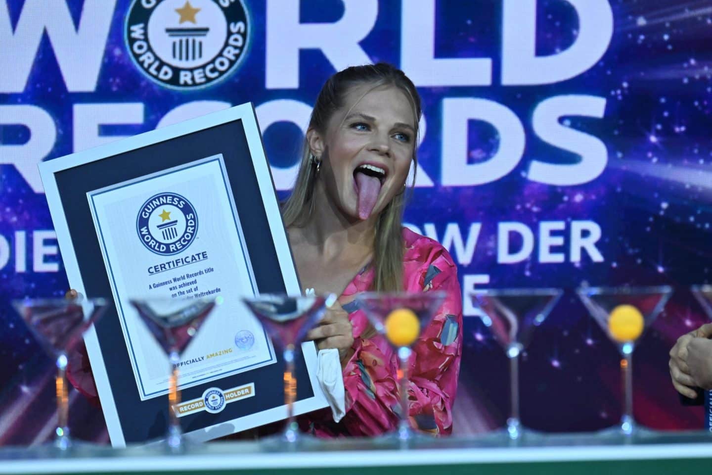 Ihre 7-Zentimeter-Zunge machte Annika Irmler schon einmal zur Guinness-Queen. Jetzt legte sie nach: In nur 60 Sekunden fischte sie 27 Tischtennisbälle aus Gläsern – zwei mehr als gefordert. Das Studio jubelte, Annika strahlte: „Ich wusste, dass ich das schaffen kann!“