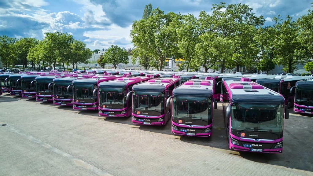 Der Ersatzverkehr der Deutschen Bahn für die Zeit der Riedbahn-Sanierung ist startklar. Sowohl die DB-eigene Flotte mit 150 neuen Gelenk- und Überlandbussen als auch das Team aus rund 400 Busfahrer:innen aus dem In- und Ausland sind komplett. Die neue DB-Busflotte (des Herstellers MAN) ist mit ihrer purpurnen Farbe leicht zu erkennen, die sich im einheitlichen Design der Haltestellen, der Wegweiser und der Hinweisschilder wiederfindet.