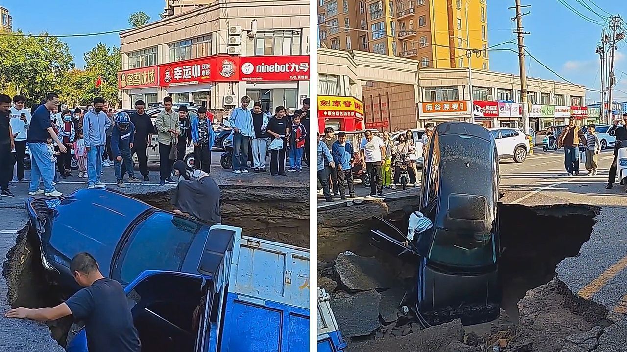 Schockmoment auf einer Straße in der chinesischen Provinz Henan: Plötzlich tat sich im Asphalt ein Senkloch auf – drei Fahrzeuge stürzten in die Tiefe. Zum Glück wurde niemand verletzt.