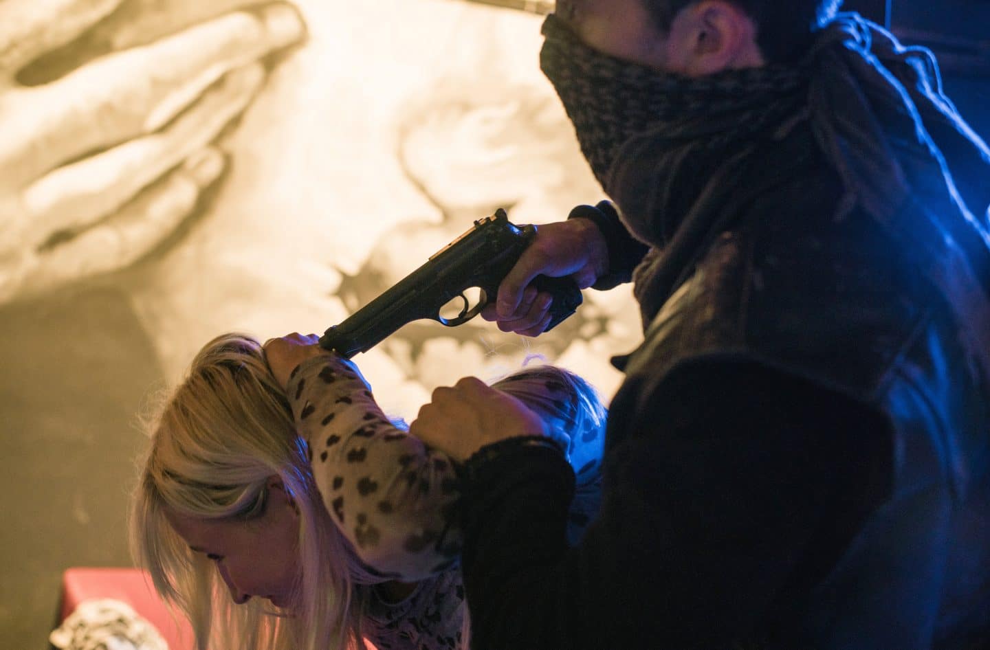 ARD Degeto DIE DIPLOMATIN – VERMISST IN ROM, am Samstag (12.07.25) um 20:15 Uhr und um 01:15 Uhr im ERSTEN. Bei einem Überfall in einem besetzten Theater wird Greta (Ines Felting) als Geisel genommen. © ARD Degeto/Roland Suso Richter, honorarfrei – Verwendung gemäß der AGB im engen inhaltlichen, redaktionellen Zusammenhang mit genannter Degeto-Sendung und bei Nennung „Bild: ARD Degeto/Roland Suso Richter“ (S2+). ARD Degeto/Programmplanung und Presse, Tel: 069/1509-335, [email protected]