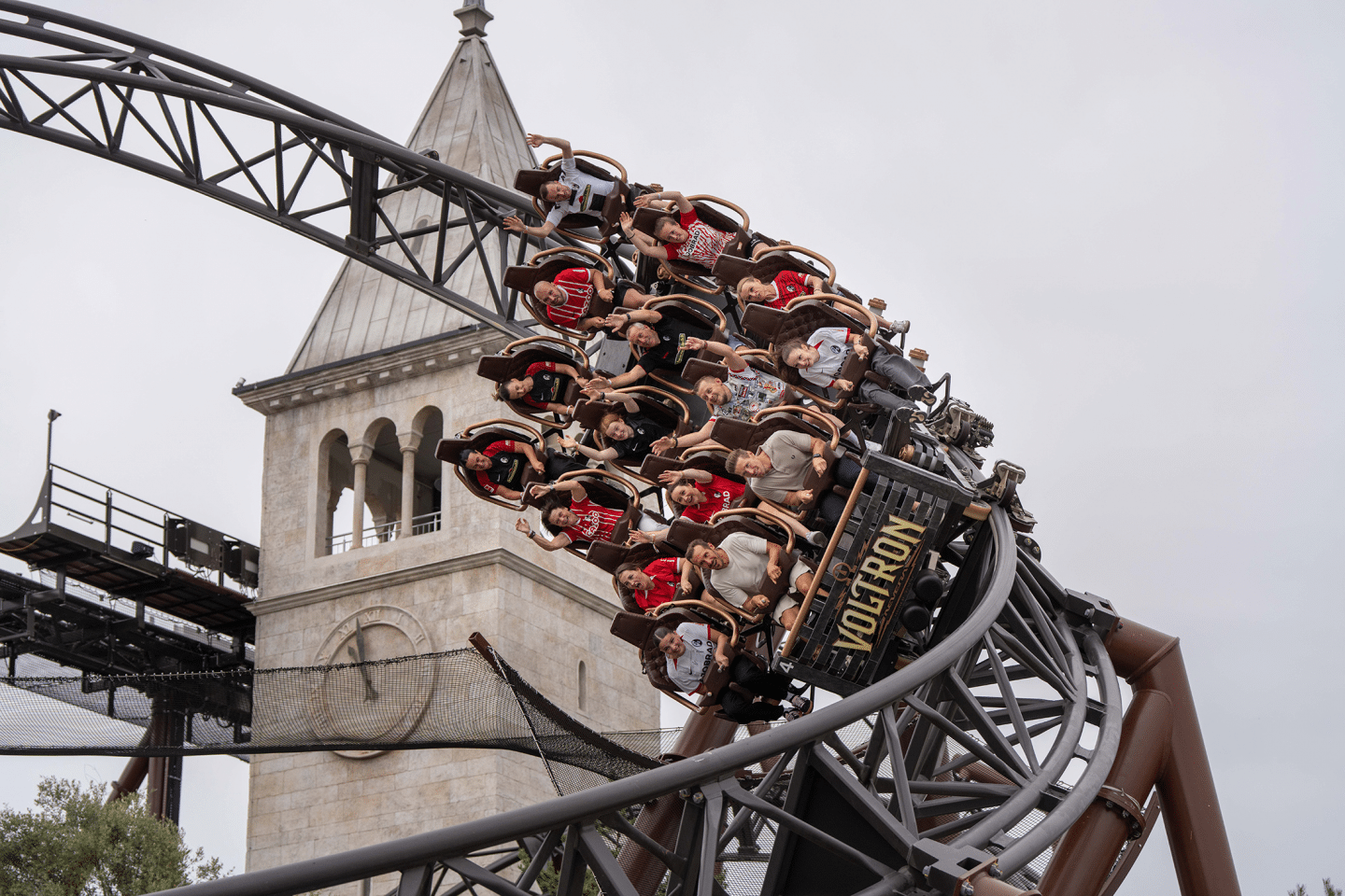 Der Park war fest in SC-Hand: Achterbahnen wie „Voltron Nevera powered by Rimac“ leuchteten in den Vereinsfarben Weiß und Rot, Maskottchen Füchsle und Ed Euromaus sorgten für Stimmung, und überall war Fanliebe spürbar.