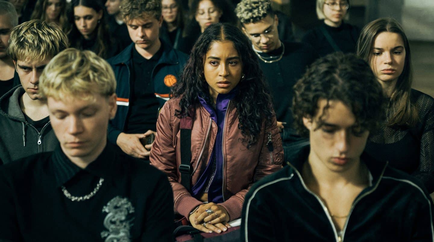 ARD Degeto SCHATTENSEITE, „Dienstag“, Folge 1, am Sonntag (26.10.25) um 21:45 Uhr im ERSTEN, online first ab Freitag (17.10.25) in der ARD MEDIATHEK Nola (Samirah Breuer, Mitte) fühlt sich unwohl auf der Trauerfeier von einem verstorbenen Mitschüler. © ARD Degeto Film/HR/funk/Dreamtool Entertainment GmbH/Elliott Kreyenberg, honorarfrei – Verwendung gemäß der AGB im engen inhaltlichen, redaktionellen Zusammenhang mit genannter Degeto-Sendung und bei Nennung „Bild: ARD Degeto Film/HR/funk/Dreamtool Entertainment GmbH/Elliott Kreyenberg“ (S2+). ARD Degeto/Programmplanung und Presse, Tel: 069/1509-335, [email protected]