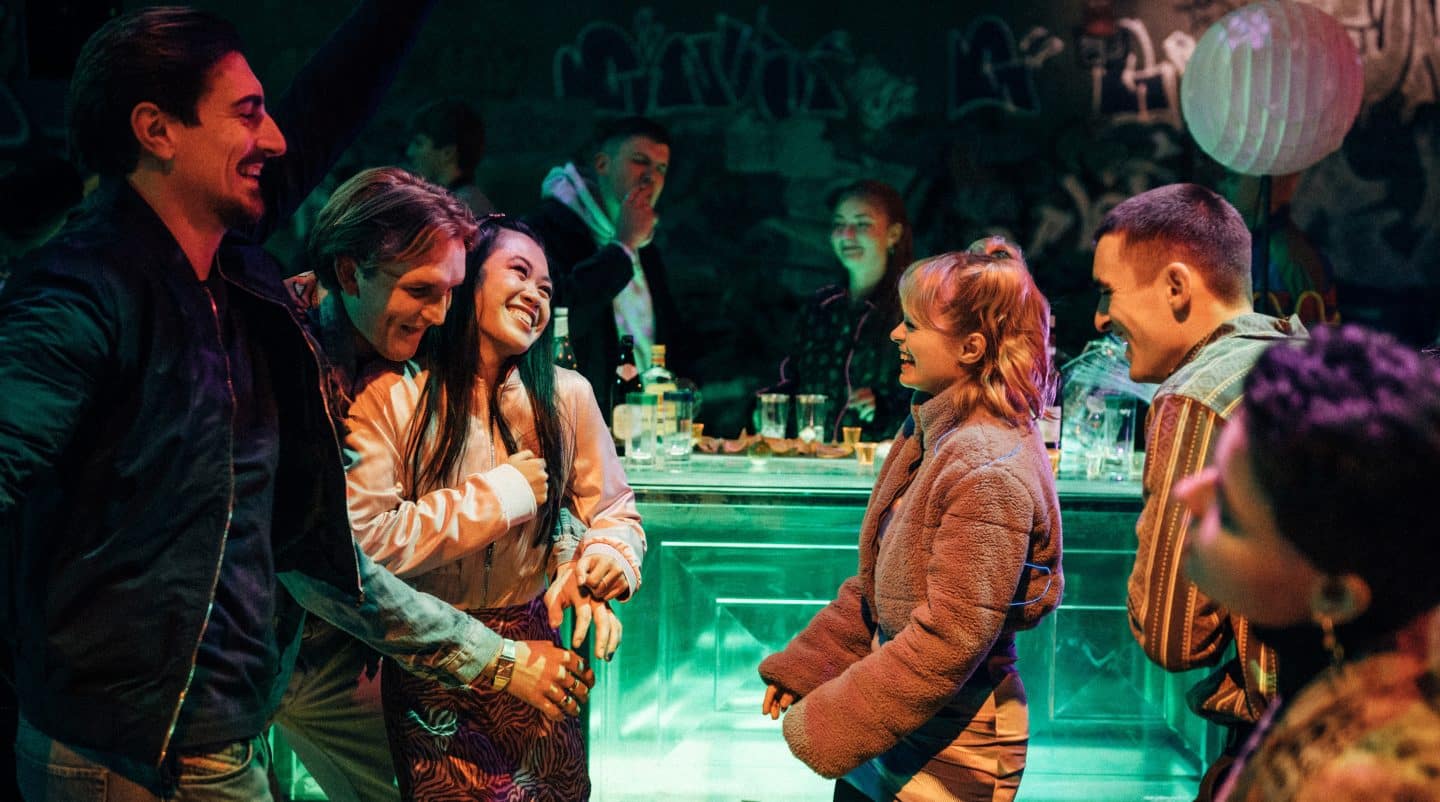 ARD Degeto SCHATTENSEITE, „Dienstag“, Folge 1, am Sonntag (26.10.25) um 21:45 Uhr im ERSTEN, online first ab Freitag (17.10.25) in der ARD MEDIATHEK Partytime: Der Lehrer Benedikt Herms (Anton Weil, li.), Simon (Ludger Böckelmann, 2. v. li.), Patricia (Tanya Nguyen) und Goldberg (Moritz Hoyer, 2. v. re.) tanzen auf Jessys (Carlotta Weide, 3. v. re.) Geburtstagsparty. © ARD Degeto Film/HR/funk/Dreamtool Entertainment GmbH/Elliott Kreyenberg, honorarfrei – Verwendung gemäß der AGB im engen inhaltlichen, redaktionellen Zusammenhang mit genannter Degeto-Sendung und bei Nennung „Bild: ARD Degeto Film/HR/funk/Dreamtool Entertainment GmbH/Elliott Kreyenberg“ (S2+). ARD Degeto/Programmplanung und Presse, Tel: 069/1509-335, [email protected]