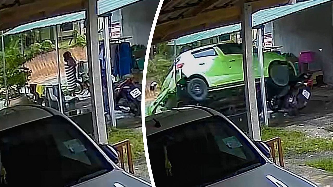 Dramatische Momente filmte eine Überwachungskamera Ende November in der thailändischen Provinz Trang. Ein Auto war außer Kontrolle geraten und schoss mit voller Wucht in eine Veranda. Das Fahrzeug verfehlte nur haarscharf eine Frau und ein Kind.