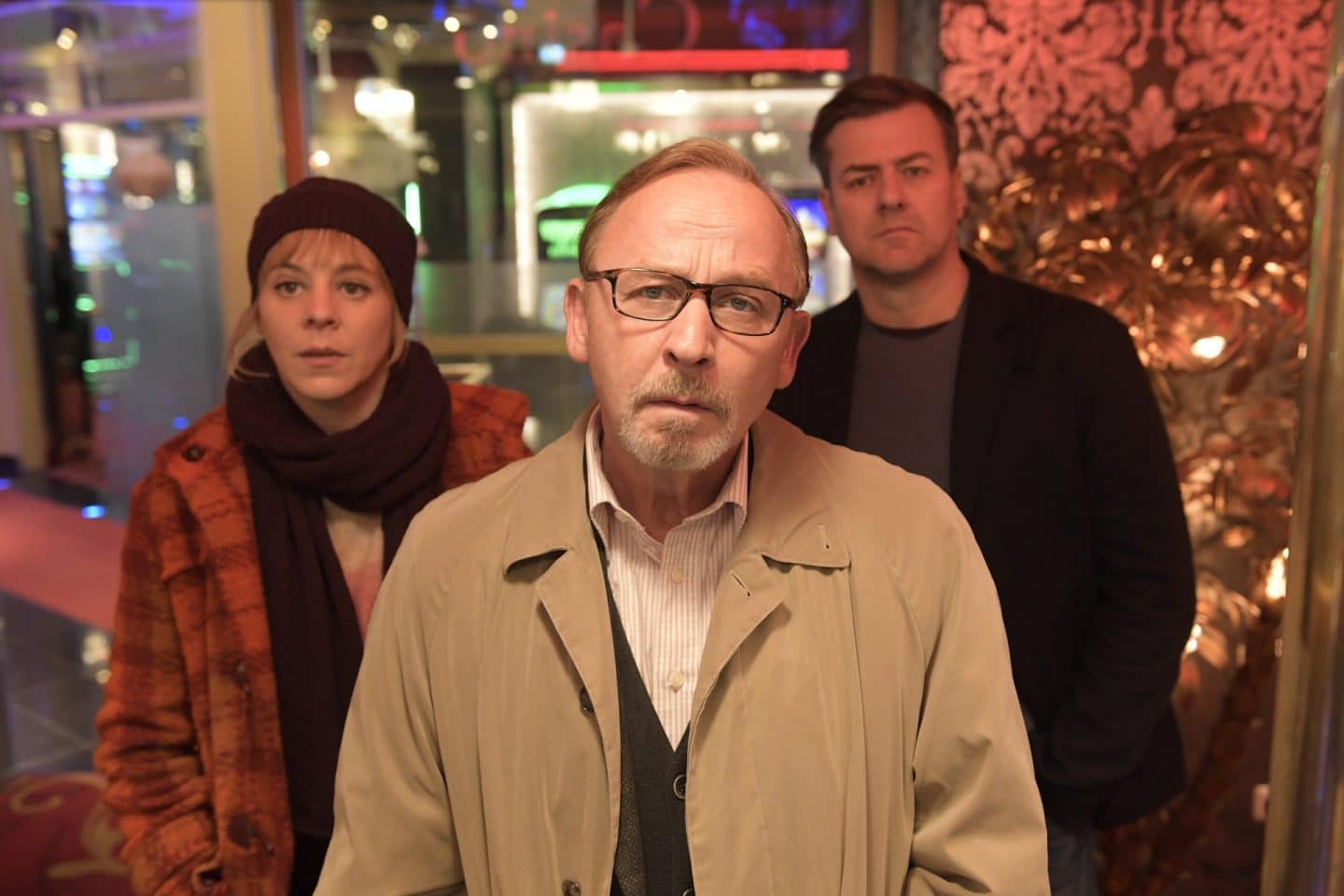 In der Spielhalle Nevada gehen die Kommissare Ludwig Schaller (Alexander Held, M.), Angelika Flierl (Bernadette Heerwagen, l.) und Harald Neuhauser (Marcus Mittermeier, r.) der Spur nach, ob das Opfer Rudi als Doppelgänger gebucht worden ist.