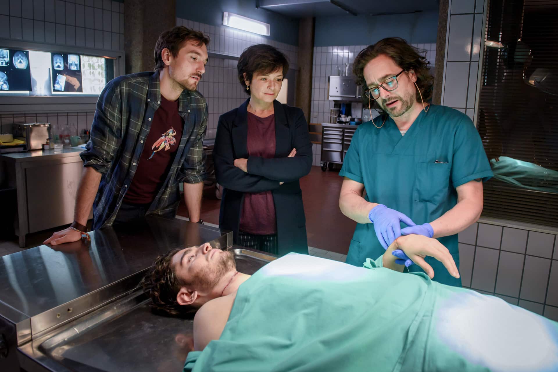 Ein Kunstprojekt, das die Überwachung im öffentlichen Raum zum Thema hat, gerät in den Fokus eines Mörders. Denn dieser begreift, dass er zusammen mit seinem Opfer gefilmt wurde. Johanna „Joe“ Haizinger (Katharina Stemberger, 2.v.l.) steht hinter ihrem Kollegen Ben Halberg (Daniel Gawlowski, M.). Ben kniet vor der Leiche (r.) und begutachtet sie.