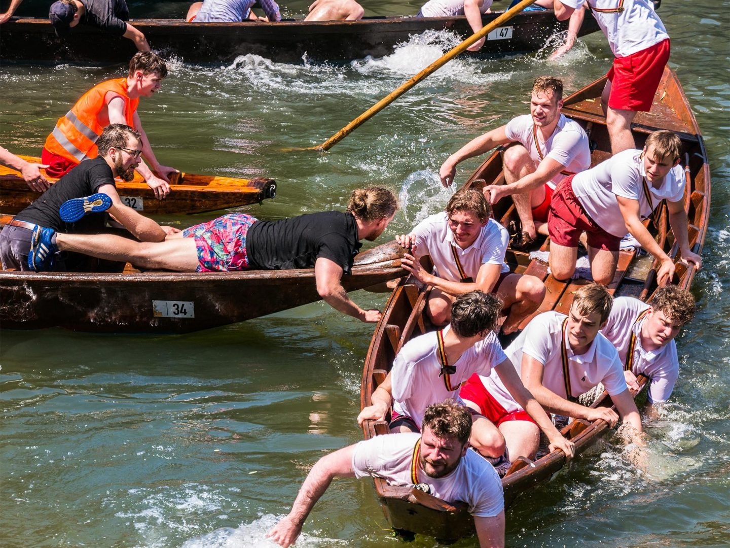 Wenn Fronleichnam auf den Kalender fällt, wird es gegen 14 Uhr plötzlich eng auf dem Tübinger Fluss. Mehr als vierzig Kähne, jeweils von acht Personen besetzt, drängeln sich im Wasser. Mit Spannung wird der Startschuss erwartet, der das wildeste und lustigste Spektakel des Tübinger Veranstaltungskalenders einläutet.