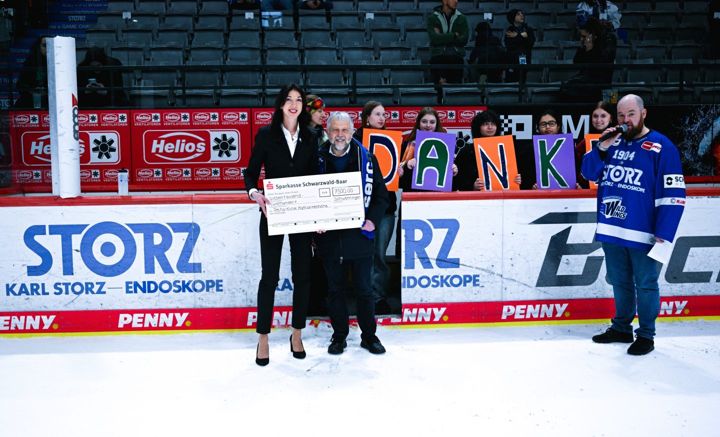 Die feierliche Übergabe des Spendenschecks fand in der ersten Drittelpause unter dem Applaus der Fans statt. Für die eingeladenen Kinder war es ein unvergesslicher Abend – sie durften ihre Idole hautnah erleben.