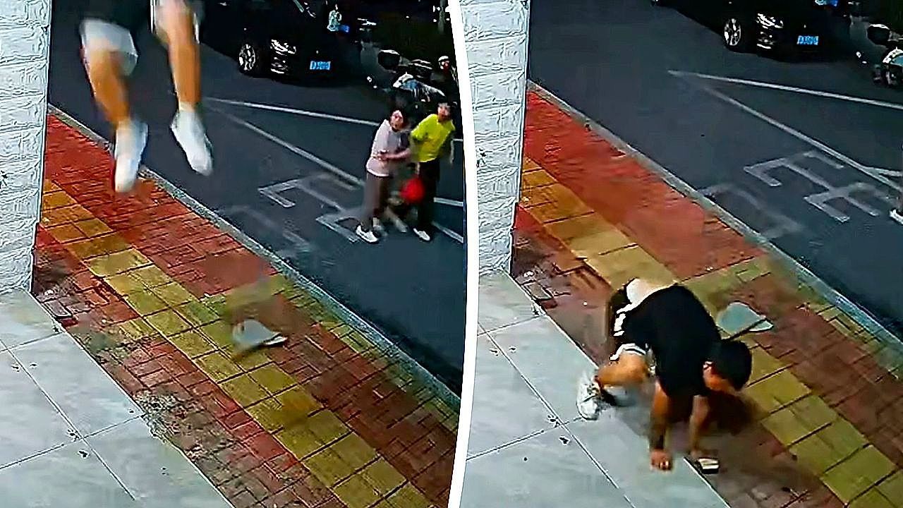 Bizarre Szenen filmte die Überwachungskamera eines Restaurants Anfang Oktober in der chinesischen Stadt Shaoyang. Ein Mann stürzte plötzlich von oben ins Bild und landete wie Spider-Man auf einem Gehweg. Der Verunglückte war durch die Decke des Restaurants gebrochen. Durch seine schnellen Reflexe blieb er nicht nur unverletzt, sondern rettete auch noch sein Handy.