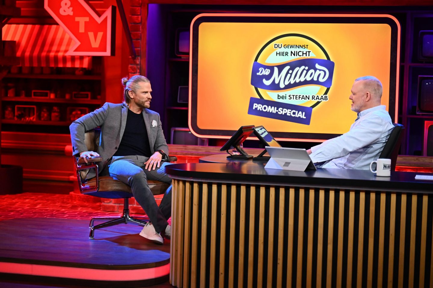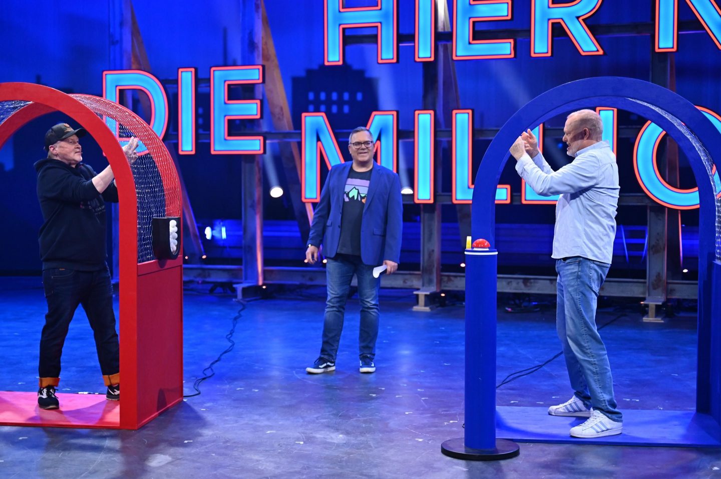 Elton übernimmt die Moderation – ganz in der Manier von „Schlag den Raab“. Freundlich, aber gnadenlos fair. Und er weiß: Gegen Stefan Raab zu gewinnen, ist selbst für Profis eine Herkulesaufgabe.