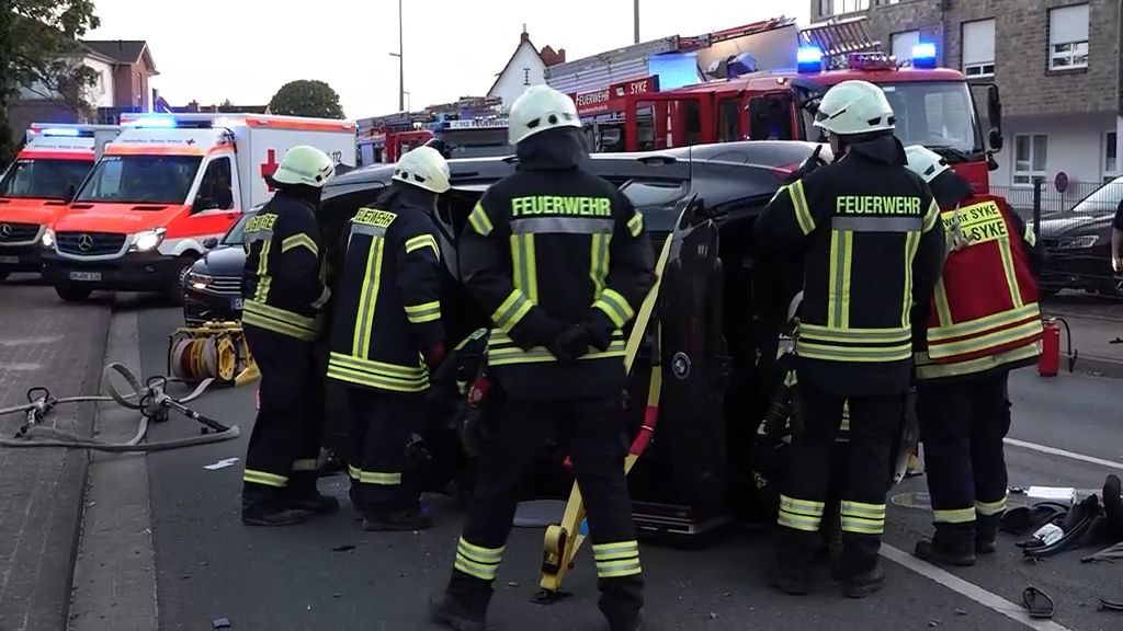 Im niedersächsischen Syke stoßen zwei Autos zusammen. Die Rettung eines Fahrers stellt sich als schwierig heraus.