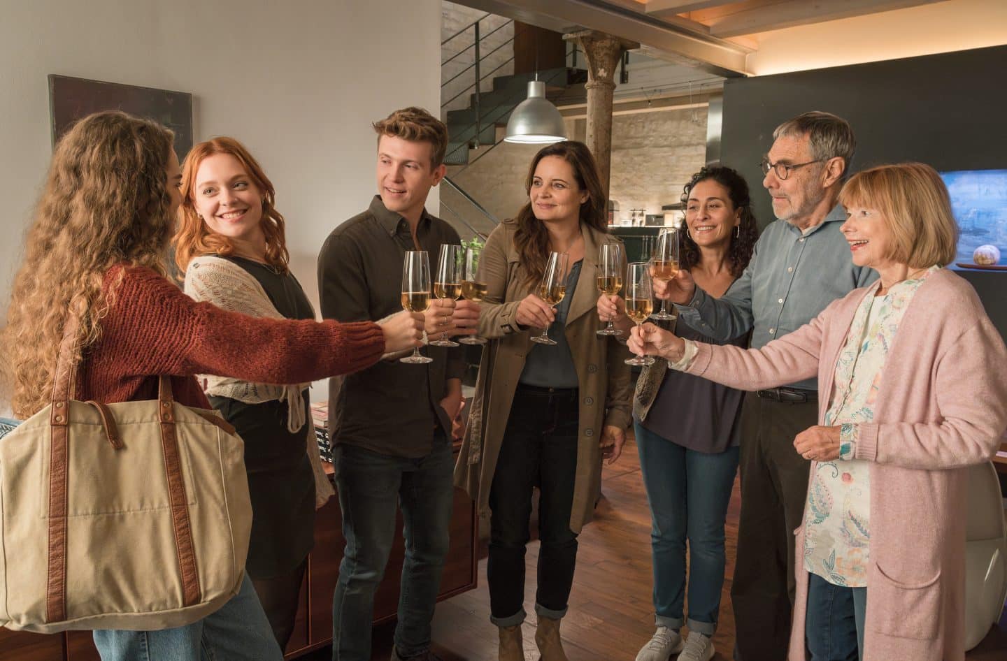 ARD TIERÄRZTIN DR. MERTENS IX. STAFFEL FOLGE 107, „Zeit für die Wahrheit“, am Dienstag (27.05.25) um 20:15 Uhr im ERSTEN. Alle Schwierigkeiten scheinen überwunden. Die ganze Familie stößt an, auf die Hochzeitspläne von Gina und Jonas. (v.l.n.r.): Luisa Mertens (Lilly Wiedemann), Gina Harzer (Amelie Hennig), Jonas Mertens (Lennart Betzgen), Susanne Mertens (Elisabeth Lanz), Maria Canonero (Marzia Tedeshi), Georg Baumgart (Gunter Schoß), Charlotte Baumgart (Ursela Monn) © ARD/Saxonia Media/Steffen Junghans, honorarfrei – Verwendung gemäß der AGB im engen inhaltlichen, redaktionellen Zusammenhang mit genannter ARD-Sendung im Ersten bei Nennung: „Bild: ARD/Saxonia Media/Steffen Junghans“ (S2). ARD Programmdirektion/Bildredaktion, [email protected]