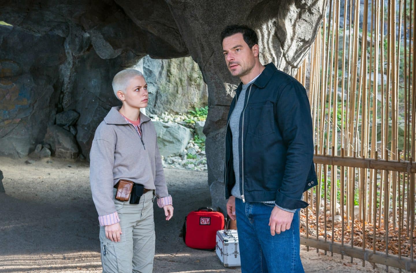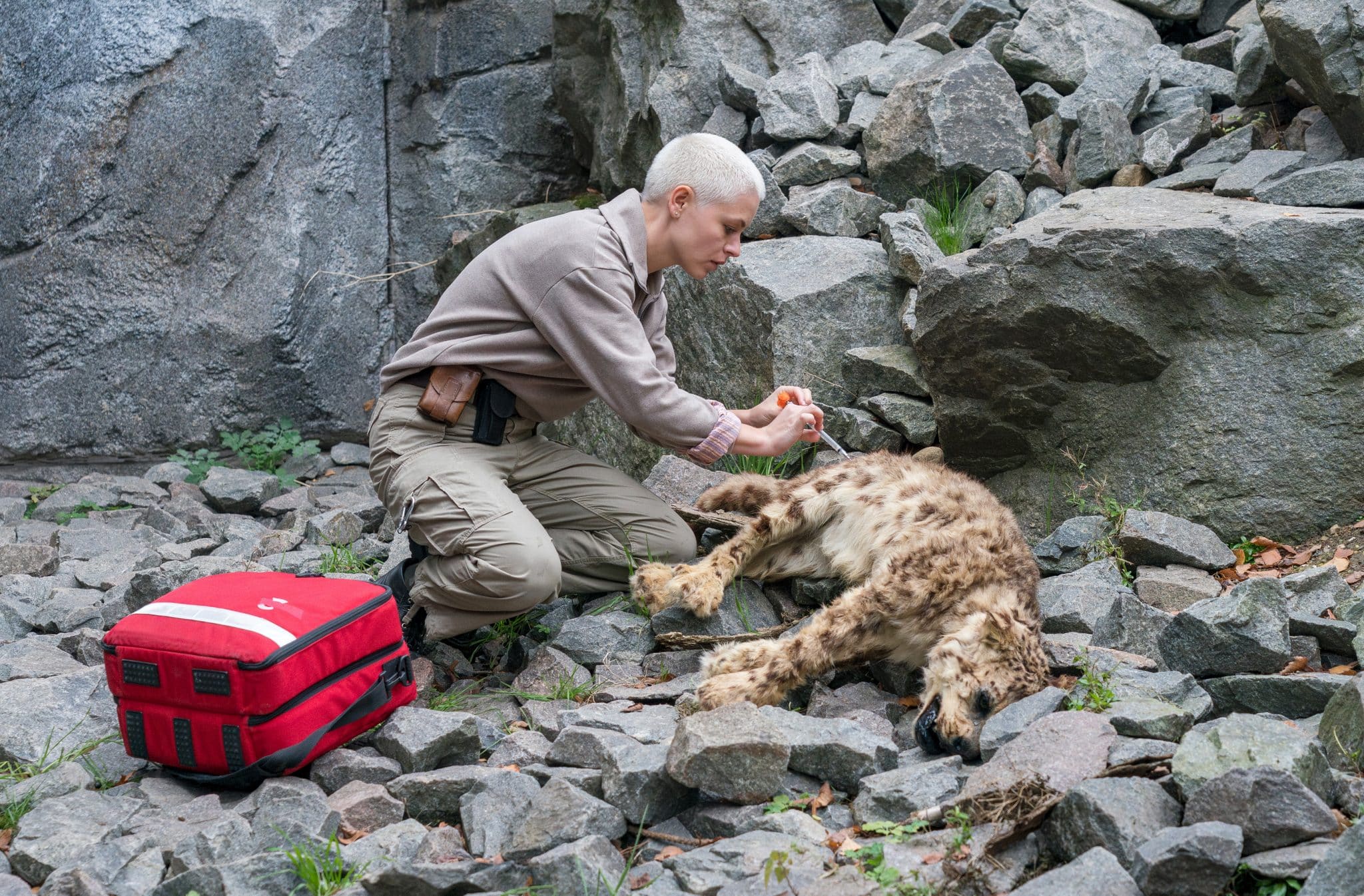 ARD TIERÄRZTIN DR. MERTENS IX. STAFFEL FOLGE 107, „Zeit für die Wahrheit“, am Dienstag (27.05.25) um 20:15 Uhr im ERSTEN. Dr. Matteo Berger (Tobias Licht, r.) muss der Schneeleopardin Blut abnehmen. Aber es kommt etwas dazwischen. Mit Sina Mayer (Antonia Breidenbach, r.) © ARD/Saxonia Media/Steffen Junghans, honorarfrei – Verwendung gemäß der AGB im engen inhaltlichen, redaktionellen Zusammenhang mit genannter ARD-Sendung im Ersten bei Nennung: „Bild: ARD/Saxonia Media/Steffen Junghans“ (S2). ARD Programmdirektion/Bildredaktion, [email protected]