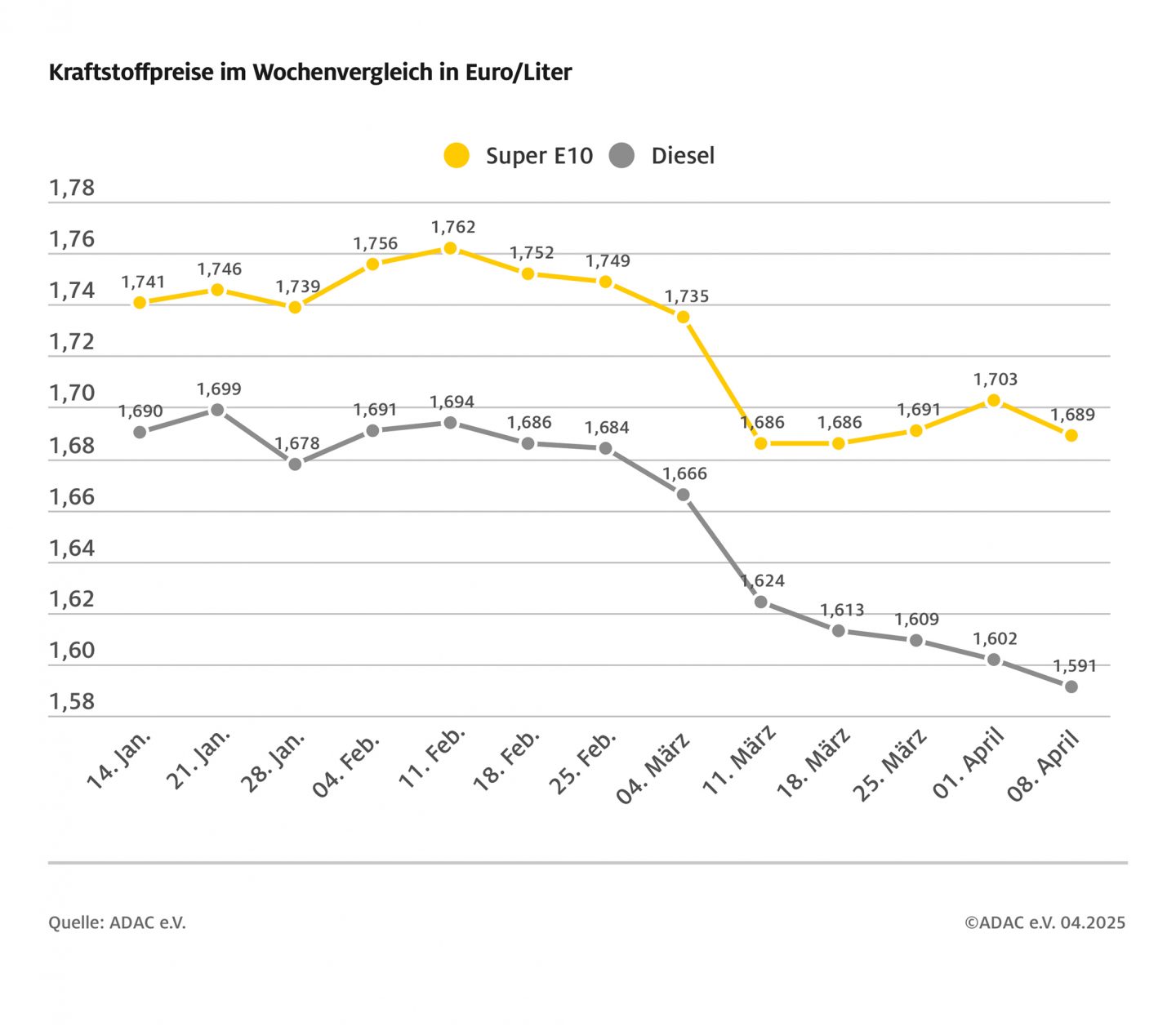 Der Preis für Super E10 sank laut ADAC gerade einmal um 1,4 Cent auf 1,689 Euro pro Liter. Bei Diesel waren es sogar nur 1,1 Cent weniger – im Schnitt liegt der Literpreis aktuell bei 1,591 Euro. Der ADAC zeigt sich unzufrieden – und fordert: Die Mineralölkonzerne müssen jetzt liefern.