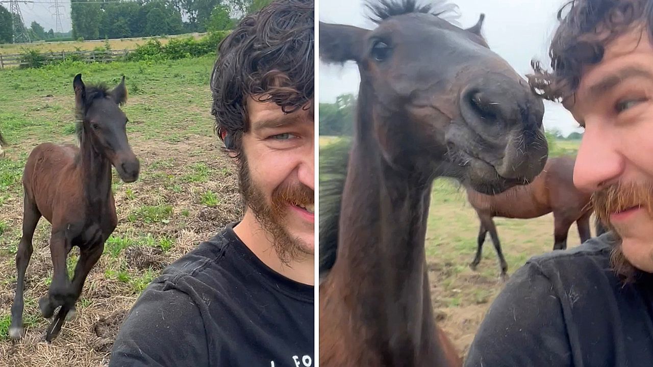 Ein Hufschmied im US-Bundesstaat Ohio lockte auf einer Weide ein Pferd mit einem Pfiff an und ließ dabei die Kamera laufen. Das Tier war allerdings einen Tick zu ungestüm.