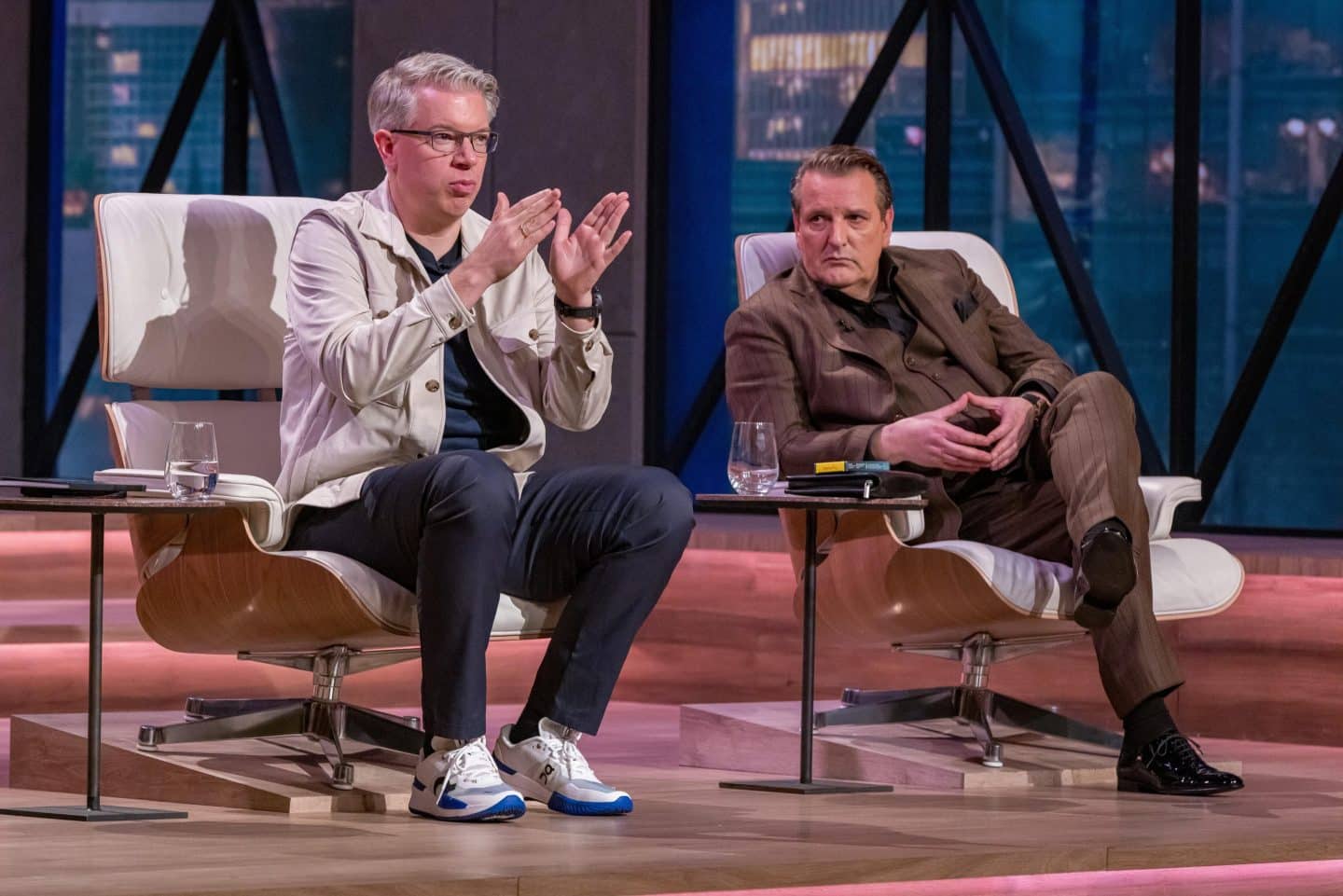 Die Investoren Frank Thelen (l.) und Ralf Dümmel nehmen den veganen Schwangerschaftstest von hey mela genau unter die Lupe. +++ Die Verwendung des sendungsbezogenen Materials ist nur mit dem Hinweis und Verlinkung auf RTL+ gestattet. +++