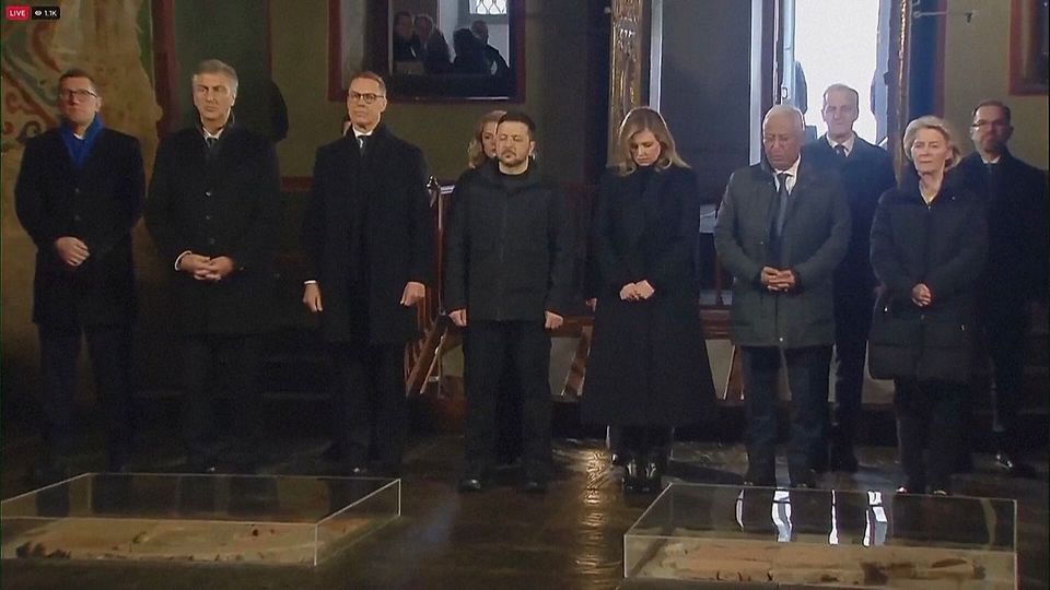 Anlässlich des vierten Jahrestags der russischen Großinvasion in die Ukraine reisten mehr als ein Dutzend hochrangige europäische Politiker in die ukrainische Hauptstadt. Bei einer Gedenkfeier in der Sophienkathedrale gedachte unter anderem Ursula von der Leyen der Kriegopfer.